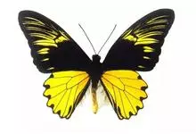 金裳凤蝶是凤蝶科、裳凤蝶属的动物。金裳凤蝶身体呈黑色,头、颈和胸侧有红毛,腹部有黑黄两色相间条纹,雄蝶前翅黑色,具黑天鹅绒光泽,各脉两侧灰白色,后翅金黄色,各室外缘有等腰三角形黑斑1枚,斑内侧有晕,…全部>>