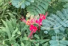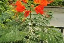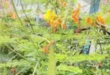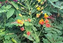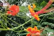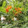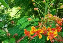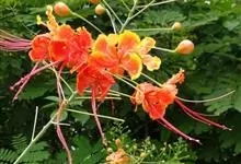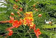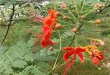 洋金凤 Sw.),豆科小凤花属灌木状或小乔木植物,枝无毛,绿或粉绿色;二回羽状复叶;总状花序伞房状,萼片无毛,花瓣橙红或黄色,圆形,花丝红色,子房无毛,花柱橙黄色;荚果窄而薄,…全部>>