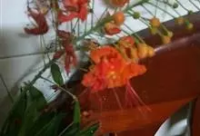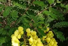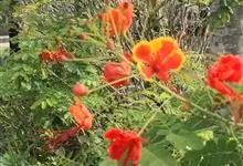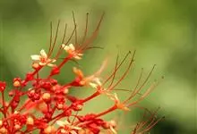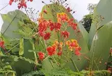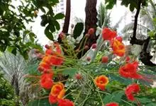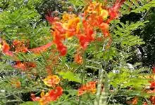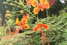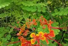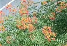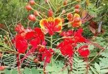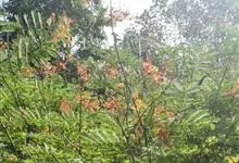 洋金凤 Sw.),豆科小凤花属灌木状或小乔木植物,枝无毛,绿或粉绿色;二回羽状复叶;总状花序伞房状,萼片无毛,花瓣橙红或黄色,圆形,花丝红色,子房无毛,花柱橙黄色;荚果窄而薄,…全部>>