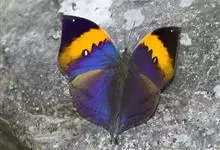 枯叶蛱蝶,又名木叶蝶、树叶蝶等,属于蛱蝶科。翅正面黑褐色,具深蓝色光泽,前翅顶角尖出,顶区有1枚小白点,中部有1条倾斜的橙色斑带,从前缘延伸至Cu室外缘,u室中部有1枚黑色圆斑,…全部>>