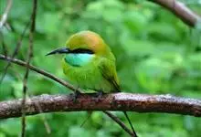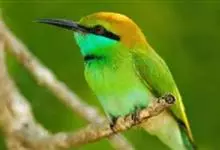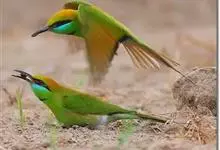 绿喉蜂虎是佛法僧目、蜂虎科的小型鸟类,共有9个亚种。身长22-25厘米,翼展29-30厘米,体重15-20克。喉绿色,额部、头顶至上背为锈红色,其余上体均为亮绿色。中央尾羽延长且端段狭细,…全部>>