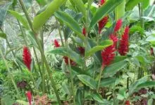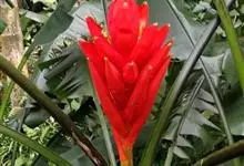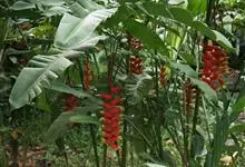 金嘴蝎尾蕉:芭蕉科,蝎尾蕉属多年生草本植物。株高可达6米。叶片长圆形,叶面绿色,叶背亮紫色;顶生花序,直立,薄被短柔毛;苞片绿色,开放时突露,花被片红色,顶端绿色,狭圆柱形,果三棱形,灰蓝色,有种子…全部>>