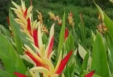 蝎尾蕉:蝎尾蕉科蝎尾蕉属植物多年生草本植物。株高可达260厘米。叶片长圆形,叶面绿色,叶背亮紫色;顶生花序,直立,薄被短柔毛;苞片绿色,开放时突露,花被片红色,顶端绿色,狭圆柱形,果三棱形,灰蓝色,…全部>>
