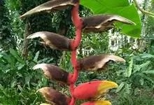 金嘴蝎尾蕉:芭蕉科,蝎尾蕉属多年生草本植物。株高可达6米。叶片长圆形,叶面绿色,叶背亮紫色;顶生花序,直立,薄被短柔毛;苞片绿色,开放时突露,花被片红色,顶端绿色,狭圆柱形,果三棱形,灰蓝色,有种子…全部>>