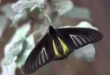 金裳凤蝶是凤蝶科、裳凤蝶属的动物。金裳凤蝶身体呈黑色,头、颈和胸侧有红毛,腹部有黑黄两色相间条纹,雄蝶前翅黑色,具黑天鹅绒光泽,各脉两侧灰白色,后翅金黄色,各室外缘有等腰三角形黑斑1枚,斑内侧有晕,…全部>>