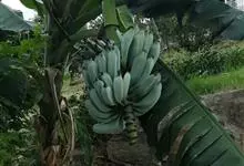 香蕉’),芭蕉科芭蕉属多年生草本植物,植株丛生,有匐匍茎;假茎浓绿有黑色斑点;叶片长圆形,上面为深绿色,无白粉,下面浅绿色;花朵为乳白色或淡紫色;果实呈弯曲的弓状,有棱,果皮为青绿色,…全部>>