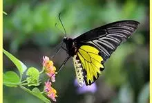 金裳凤蝶是凤蝶科、裳凤蝶属的动物。金裳凤蝶身体呈黑色,头、颈和胸侧有红毛,腹部有黑黄两色相间条纹,雄蝶前翅黑色,具黑天鹅绒光泽,各脉两侧灰白色,后翅金黄色,各室外缘有等腰三角形黑斑1枚,斑内侧有晕,…全部>>