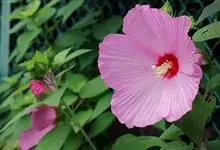芙蓉葵是锦葵科木槿属植物,又名草芙蓉、大花秋葵,原产于北美。落叶灌木状。叶大、广卵形,叶柄、叶背密生灰色星状毛。花大,单生于叶腋,有白、粉、红、紫等色。喜阳、略耐阴,宜温暖湿润气候,忌干旱,耐水湿,…全部>>