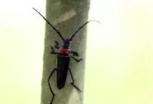 桃红颈天牛是天牛科、颈天牛属昆虫。体黑色发亮,前胸背面大部分为光亮的棕红色或完全黑色。头黑色,腹面有许多横皱,头顶部两眼间有深凹。触角蓝紫色,前胸背面前后缘呈黑色并收缩下陷密布横皱。鞘翅表面光滑。…全部>>