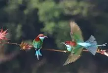 栗喉蜂虎是蜂虎科蜂虎属的鸟类。有热带鸟类羽毛艳丽的特征:喉部是栗红色的,黑色的过眼纹,翅膀和背部是绿色的,尾翼是蓝色的,飞行时翅膀下面的羽毛是橙黄色的,在阳光的照射下,它们全身闪烁着金属般的艳丽光泽,…全部>>
