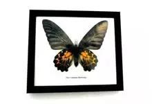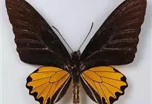 金裳凤蝶是凤蝶科、裳凤蝶属的动物。金裳凤蝶身体呈黑色,头、颈和胸侧有红毛,腹部有黑黄两色相间条纹,雄蝶前翅黑色,具黑天鹅绒光泽,各脉两侧灰白色,后翅金黄色,各室外缘有等腰三角形黑斑1枚,斑内侧有晕,…全部>>