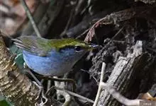 金冠地莺:形态与灰腹地莺相似,上体橄榄绿,前额至头顶渲染亮金黄色;下体几乎纯暗石板灰色,下嘴基部橙红色或橙黄色。虹膜褐色;上嘴角褐色,下嘴基部橙红色或深橙黄色直至嘴尖;跗跖和趾褐色,爪褐色。…全部>>