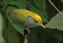 金冠地莺:形态与灰腹地莺相似,上体橄榄绿,前额至头顶渲染亮金黄色;下体几乎纯暗石板灰色,下嘴基部橙红色或橙黄色。虹膜褐色;上嘴角褐色,下嘴基部橙红色或深橙黄色直至嘴尖;跗跖和趾褐色,爪褐色。…全部>>