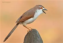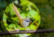 金眼鹛雀是莺科、鹛雀属小型鸟类。体长16-20厘米。头顶和上体棕褐色,两翅表面肉桂红色,尾褐色具明暗相间横斑。眼周金黄色,眼先、眼上、眼下、颊以及颏、喉和上胸概为白色,其余下体茶黄色,脚橙黄色。…全部>>