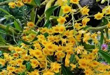 束花石斛是兰科石斛属植物。茎粗厚,肉质,下垂或弯垂,圆柱形,不分枝,具多节。叶二列,互生于整个茎上,纸质,长圆状披针形。伞状花序近无花序柄,每2-6花为一束,侧生于具叶的茎上部;花黄色,…全部>>