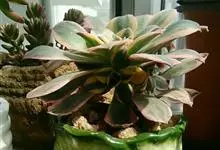 红缘莲花掌属蔷薇目、景天科植物,原产大西洋的加那利群岛。质厚,蓝绿色,被白霜,叶缘红褐色。聚伞花序,花浅黄色,有时带红晕。叶形叶色较美,有一定的观赏价值,多盆栽用于点缀室内;可放置于电视、电脑旁,…全部>>