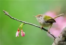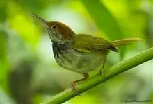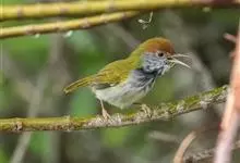 普通缝叶莺,是雀形目鹅科莺亚科缝叶莺属一种。体长10-14厘米,体重7-10克,雄鸟前额棕红,头顶至枕棕橄榄褐,上体橄榄绿染黄,飞羽及尾羽暗褐;繁殖期雄鸟的中央尾羽特形延长,下体淡皮黄白色。…全部>>