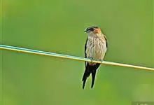 金腰燕:体长16-18厘米,体重18-21克,寿命15年。上体黑色,具有辉蓝色光泽,腰部栗色,脸颊部棕色,下体棕白色,而多具有黑色的细纵纹,尾甚长,为深凹形。最显著的标志是有一条栗黄色的腰带,…全部>>