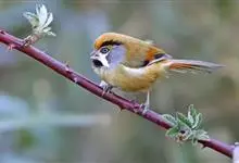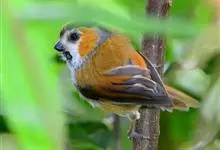 点胸鸦雀是莺科、鸦雀属小型鸟类,体长18-21厘米。头顶至枕橙棕色,嘴橙黄色、短而粗厚,脸皮黄色,耳覆羽和颊后部黑色,眼圈白色。上体棕褐色。颏黑色,其余下体淡皮黄白色,喉和上胸具黑色矢状斑。…全部>>