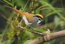 点胸鸦雀是莺科、鸦雀属小型鸟类,体长18-21厘米。头顶至枕橙棕色,嘴橙黄色、短而粗厚,脸皮黄色,耳覆羽和颊后部黑色,眼圈白色。上体棕褐色。颏黑色,其余下体淡皮黄白色,喉和上胸具黑色矢状斑。…全部>>