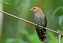 翠金鹃体长约17厘米,雄鸟上体辉绿色,头至背缀有很多棕栗色,颏和喉具黑褐色横斑;雌鸟上体自背以下具棕色羽缘。虹膜淡红褐色至绯红色,眼圈绯红色,嘴亮橙黄色,尖端黑色,脚暗褐绿色。…全部>>