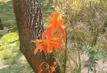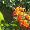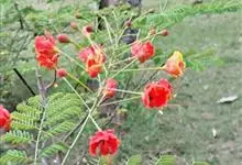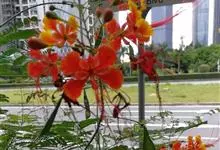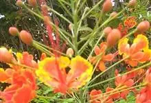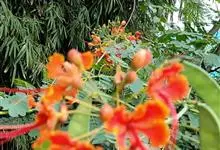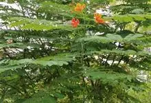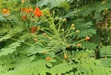 洋金凤 Sw.),豆科小凤花属灌木状或小乔木植物,枝无毛,绿或粉绿色;二回羽状复叶;总状花序伞房状,萼片无毛,花瓣橙红或黄色,圆形,花丝红色,子房无毛,花柱橙黄色;荚果窄而薄,…全部>>