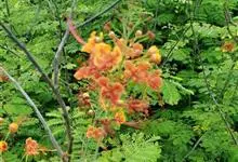 洋金凤 Sw.),豆科小凤花属灌木状或小乔木植物,枝无毛,绿或粉绿色;二回羽状复叶;总状花序伞房状,萼片无毛,花瓣橙红或黄色,圆形,花丝红色,子房无毛,花柱橙黄色;荚果窄而薄,…全部>>
