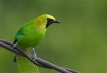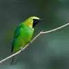 蓝翅叶鹎:小型鸟类,体长15-18厘米。雄鸟通体草绿色,尾蓝绿色,肩和翅亮蓝 色,胸缀有黄色,颏、喉黑色。雌鸟颏,喉蓝绿色。栖息在海拔1500米以下的常绿阔叶林、次生林和林缘疏林灌丛中。…全部>>