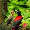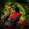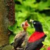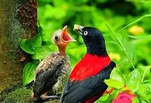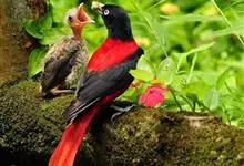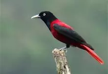 朱鹂:中等鸟类,体长23-28厘米。雄鸟绛紫红色,头、上胸及翼黑色。雌鸟上背及背部深灰色,尾覆羽及尾绛紫红色,腹部及下胸白而密布黑色纵纹。与鹊色鹂幼鸟的区别在上背灰色较深,下体白色较少且纵纹较粗。…全部>>