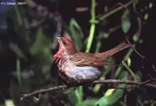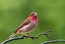酒红朱雀小型鸟类,体长13~15厘米。雄鸟通体深红色,头部深朱红或棕红色,下背和腰玫瑰红色,眉纹粉红色而具丝绢光泽。两翅和尾黑褐或灰褐色、具暗红色狭缘,内侧两枚三级飞羽具淡粉红色先端。…全部>>
