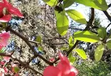 贴梗海棠Nakai)是蔷薇科、木瓜海棠属植物。落叶灌木,高达2米,枝条直立开展,有刺。叶片卵形至椭圆形,稀长椭圆形,长3-9厘米,宽1.5-5厘米。花先叶开放,3-5朵簇生于二年生老枝上。…全部>>