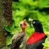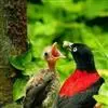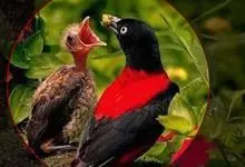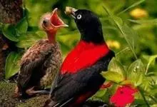 朱鹂:中等鸟类,体长23-28厘米。雄鸟绛紫红色,头、上胸及翼黑色。雌鸟上背及背部深灰色,尾覆羽及尾绛紫红色,腹部及下胸白而密布黑色纵纹。与鹊色鹂幼鸟的区别在上背灰色较深,下体白色较少且纵纹较粗。…全部>>