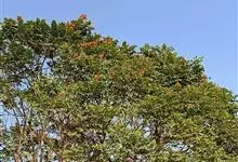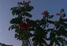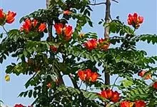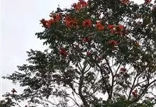火焰树是紫葳科、火焰树属乔木,树皮平滑,灰褐色。奇数羽状复叶,对生,连叶柄长达45厘米;小叶13-17枚,叶片椭圆形至倒卵形,伞房状总状花序,顶生,密集;被褐色微柔毛,具有明显的皮孔;花冠一侧膨大,…全部>>