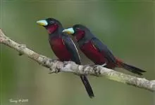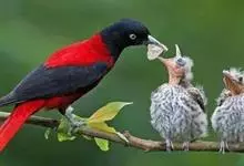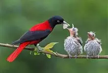 朱鹂:中等鸟类,体长23-28厘米。雄鸟绛紫红色,头、上胸及翼黑色。雌鸟上背及背部深灰色,尾覆羽及尾绛紫红色,腹部及下胸白而密布黑色纵纹。与鹊色鹂幼鸟的区别在上背灰色较深,下体白色较少且纵纹较粗。…全部>>