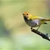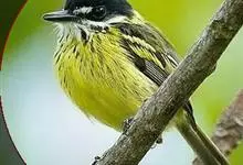 黑脸鹟莺:体长10厘米,是有特色的体小而多彩的莺鸟。粗眉纹,颏、喉及尾下覆羽黄色,脸罩黑,头顶及颈背灰色,上体绿,无翼纹,腹白。虹膜褐色;上嘴色深,下嘴肉色;脚偏绿色。…全部>>