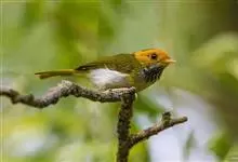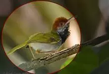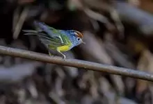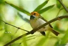 棕脸鹟莺:体长10厘米,是一种色彩亮丽而有特色的莺鸟。头栗色,具黑色侧冠纹。上体绿,腰黄色。下体白,颏及喉杂黑色点斑,上胸沾黄。与栗头鹟莺的区别在头侧栗色,白色眼圈不显著且无翼斑。…全部>>