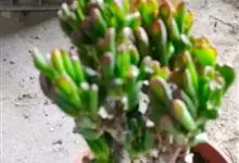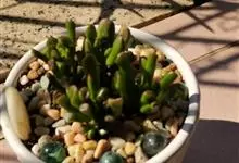 筒叶花月,是景天科青锁龙属的多年生草本植物。植株多分株,灌木状,茎较粗壮,圆柱形,表皮灰褐色;叶片肉质,互生,呈圆筒状,簇生于茎或分枝顶端,叶端呈斜截形,截面为椭圆形;花呈星状,淡白色;花期秋季。…全部>>