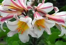 麝香百合:在中国台湾亦称铁炮百合。鳞茎球形或近球形,高2.5-5厘米;鳞片白色。茎高45-90厘米,绿色,基部为淡红色。叶散生,披针形或矩圆状披针形,两面无毛。花单生或2-3朵;花喇叭形,白色,筒外…全部>>