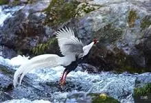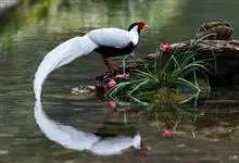 白鹇,是鸡形目雉科鹇属的一种留鸟。雄鸟上体白色并具黑色纹,下体黑色,头顶具黑色长羽冠,尾白而长;雌鸟体型较小,以橄榄褐色为主,下体具白色或皮黄色细纹;虹膜褐色,眼周具红色裸皮,喙黄色,脚鲜红色。…全部>>