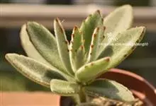 褐斑伽蓝是景天科伽蓝菜属的多年生多肉类植物,茎直立,多分枝,叶生于枝上,肉质叶片匙形,上面密被白色绒毛,下部全缘,叶缘上部有缺刻,缺刻处有深褐或棕色斑块。褐斑伽蓝原产非洲的马达加斯加岛。…全部>>