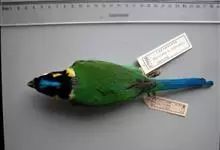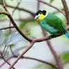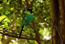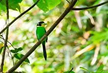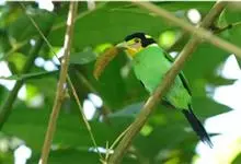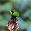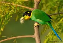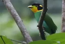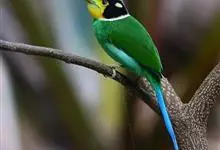 长尾阔嘴鸟是雀形目阔嘴鸟科的鸟类,体长约25厘米,是绿色阔嘴鸟。形长的楔形尾蓝色,喉及脸黄色,顶冠及颈背黑色。两翼黑并具显著的蓝色斑块。头顶具蓝色小点斑,眼后有一黄色点斑。亚成鸟多为绿色。结群活动于…全部>>