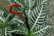 银脉爵床,又名斑马花、斑马爵床,爵床科单药花属植物。茎直立、方形、植株粗壮,略带肉质。叶对生,卵形或椭圆状卵形,叶子长约15cm~20cm,宽约10cm;叶端尖,叶片深绿色有光泽,…全部>>