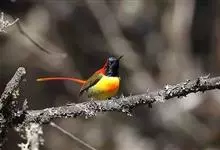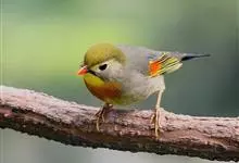 银耳相思鸟小型鸟类,体长14~18厘米。头顶黑色,耳羽银灰色,前额橙黄色;外侧飞羽橙黄色,基部朱红色,极为鲜艳、醒目。尾圆形,尾上、尾下覆羽朱红色,尾暗灰褐色,外侧尾羽橙黄色,其余上体橄榄绿或橄榄黄色。…全部>>