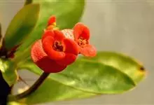 铁海棠为大戟科大戟属蔓生灌木植物;茎多分枝,具纵棱,呈旋转状;叶互生,通常集中于嫩枝上;每个花序基部边缘具微小的红色尖头;苞叶先端圆且具小尖头,无柄,上面鲜红色,下面淡红色;苞片丝状;子房光滑无毛,…全部>>