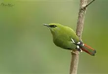 火尾绿鹛是莺科、绿鹛属小型鸟类,体长11-14厘米。上体绿色,头顶至枕具黑色鳞状斑,眼先和眼后黑色,眉纹黄绿色。两翅黑色具黄色和红色翅斑及白色端斑,极为醒目。中央一对尾羽绿色,外侧尾羽鲜红色。…全部>>