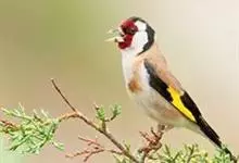 红额金翅雀:共有14个亚种。小型鸟类,体长12-14厘米。额、脸颊和颏朱红色,眼先和眼周黑色,在淡色的头部极为醒目。上体灰褐或乌褐色,尾上覆羽白色,两翅和尾黑色,翅上有黄色斑。下体喉、胸灰褐或乌褐色…全部>>