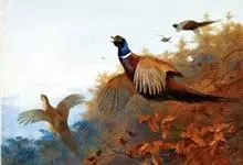 环颈雉是雉科、雉属的一种走禽,共有30个亚种。体重900-1050克,体长53-89厘米。体型较家鸡略小,但尾巴却长得多。雄鸟和雌鸟羽色不同,雄鸟羽色华丽,多具金属反光,…全部>>