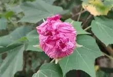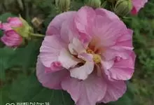 木芙蓉,锦葵科木槿属落叶灌木或小乔木。小枝上有细绒毛;叶片为卵状心形,托叶为披针形,常早落;花单生,花萼为钟形,花冠初为白色或淡红色,后逐渐变为深红色;果实为扁球形,有淡黄色的毛附着。花期8到10月。…全部>>