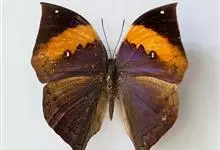 枯叶蛱蝶,又名木叶蝶、树叶蝶等,属于蛱蝶科。翅正面黑褐色,具深蓝色光泽,前翅顶角尖出,顶区有1枚小白点,中部有1条倾斜的橙色斑带,从前缘延伸至Cu室外缘,u室中部有1枚黑色圆斑,…全部>>