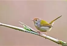 普通缝叶莺,是雀形目鹅科莺亚科缝叶莺属一种。体长10-14厘米,体重7-10克,雄鸟前额棕红,头顶至枕棕橄榄褐,上体橄榄绿染黄,飞羽及尾羽暗褐;繁殖期雄鸟的中央尾羽特形延长,下体淡皮黄白色。…全部>>